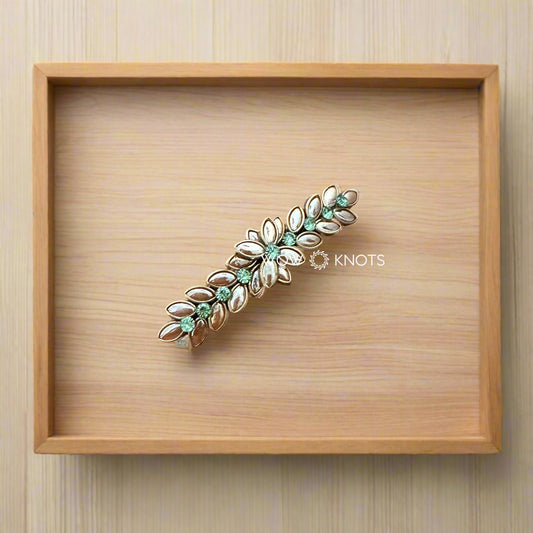 Green Kundan Petal Barrette Clip with White Stone – Handcrafted Hair Accessory