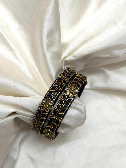 Black Silk Thread Kundan Bangles(Black Diamond Gold Drop and Round Kundans)