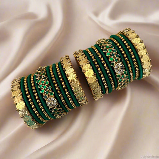 Green Glossy Silk Thread Kundan Bangles(Green Triangle Shaped Glossy Kundans)