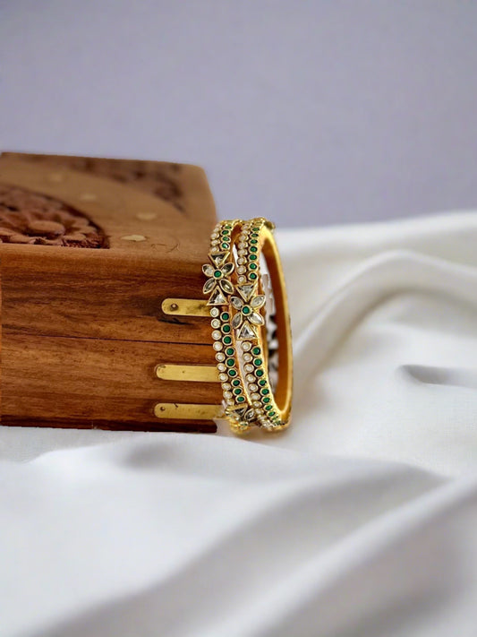 Green and Gold 3D Flower Kundan Bangle Set (Glossy Petal Side Kada Bangles)